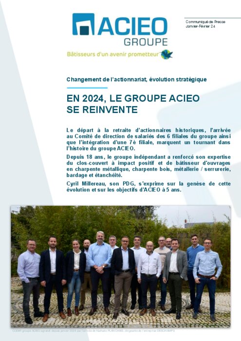 Le départ à la retraite d’actionnaires historiques, l’arrivée au Comité de direction de salariés des 6 filiales du groupe ainsi que l’intégration d’une 7è filiale, marquent un tournant dans l’histoire du groupe ACIEO. Depuis 18 ans, le groupe indépendant a renforcé son expertise du clos-couvert à impact positif et de bâtisseur d'ouvrages en charpente métallique, charpente bois, métallerie / serrurerie, bardage et étanchéité. Cyril Millereau, son PDG, s’exprime sur la genèse de cette évolution et sur les objectifs d’ACIEO à 5 ans.
