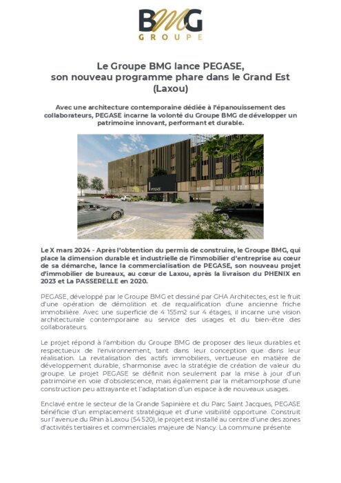Après l’obtention du permis de construire, le Groupe BMG, qui place la dimension durable et industrielle de l’immobilier d’entreprise au cœur de sa démarche, lance la commercialisation de PEGASE, son nouveau projet d’immobilier de bureaux, au cœur de Laxou, après la livraison du PHENIX en 2023 et La PASSERELLE en 2020.
