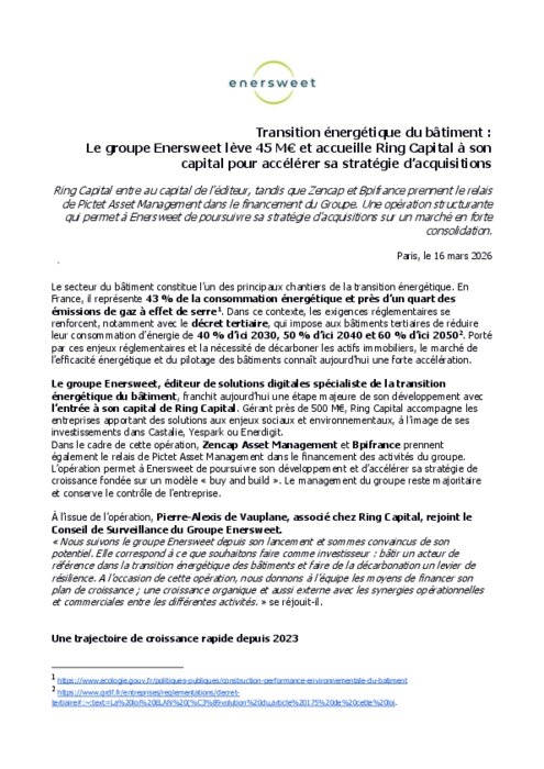 Ring Capital entre au capital de l’éditeur, tandis que Zencap et Bpifrance prennent le relais de Pictet Asset Management dans le financement du Groupe. Une opération structurante qui permet à Enersweet de poursuivre sa stratégie d’acquisitions sur un marché en forte consolidation.