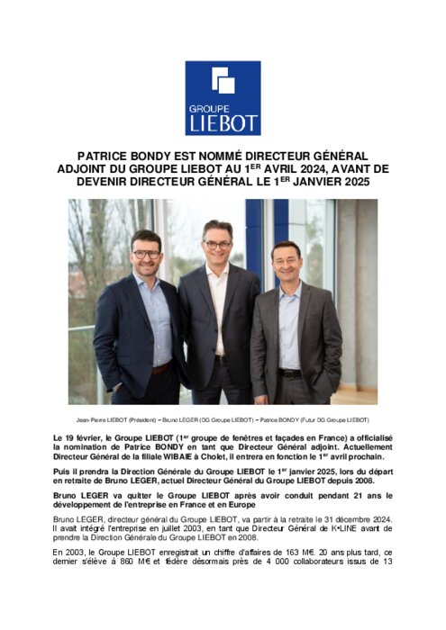 Le Groupe LIEBOT, 1er groupe de fenêtres et façades en France, annonce la nomination de Patrice BONDY en tant que Directeur Général Adjoint au 1er avril 2024. Le 1er janvier 2025, il en sera nommé Directeur Général, et succédera à Bruno LEGER (départ à la retraite).