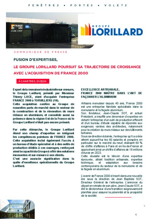 Expert de la menuiserie industrielle sur-mesure, le Groupe Lorillard, présidé par Monsieur Thierry LUCE, vient d’acquérir l’entreprise FRANCE 2000 à TORVILLIERS (10). Cette acquisition confère au Groupe de nouvelles parts de marché dans le secteur de la construction et de la rénovation de murs rideaux en aluminium, et consolide aussi sa présence dans la région Est de la France où le Groupe Lorillard n’était pas encore présent.