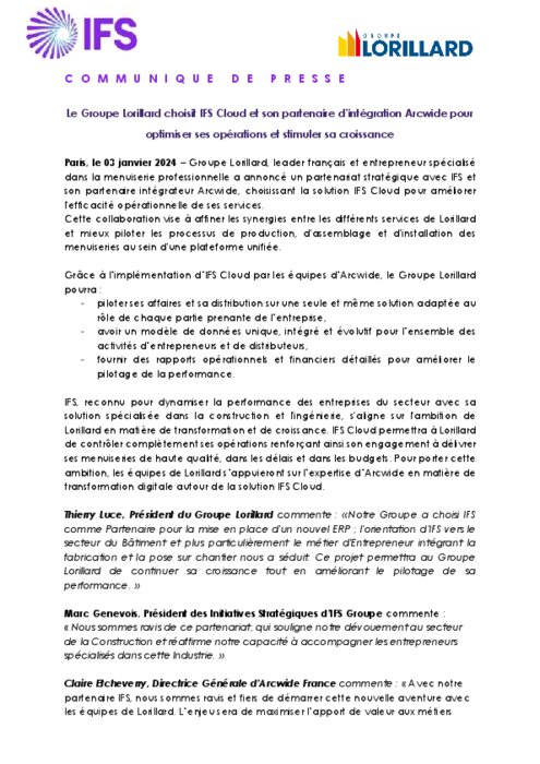 Groupe Lorillard, leader français et entrepreneur spécialisé dans la menuiserie professionnelle a annoncé un partenariat stratégique avec IFS et son partenaire intégrateur Arcwide, choisissant la solution IFS Cloud pour améliorer l'efficacité opérationnelle de ses services.