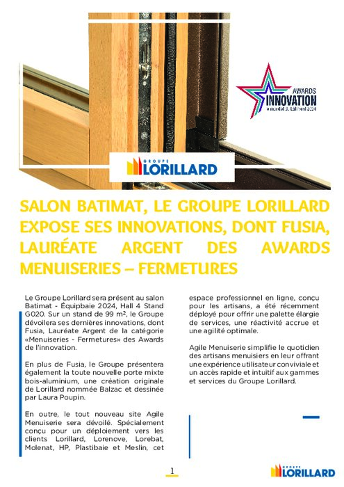 Le Groupe Lorillard sera présent au salon Batimat - Équipbaie 2024, Hall 4 Stand G020. Sur un stand de 99 m², le Groupe dévoilera ses dernières innovations, dont Fusia, Lauréate Argent de la catégorie «Menuiseries - Fermetures» des Awards de l’innovation. En plus de Fusia, le Groupe présentera également la toute nouvelle porte mixte bois-aluminium, une création originale de Lorillard nommée Balzac et dessinée par Laura Poupin.
