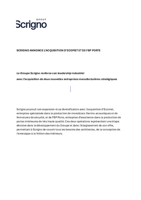 Scrigno poursuit son expansion et sa diversification avec l’acquisition d’Ecomet, entreprise spécialisée dans la production de monoblocs thermo-acoustiques et de fermetures de sécurité, et de FBP Porte, entreprise d’excellence dans la production de portes intérieures de très haute qualité. Ces deux opérations représentent une étape décisive dans le développement du Groupe et dans l’élargissement de son offre, permettant à Scrigno de couvrir tous les besoins des architectes, de la conception de l’enveloppe à la finition des intérieurs.
