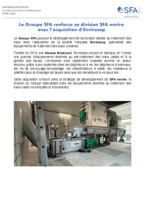 Industriels 02 avril 2026 - 11:56 Le Groupe SFA poursuit le développement de sa division dédiée au traitement des eaux avec l’acquisition de la société française Envirosep, spécialiste des équipements de traitement des eaux urbaines. PDF (2 Mo) Télécharger Crédit photo : SFA