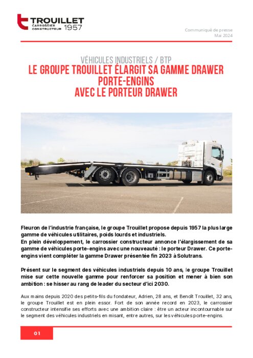 gamme de véhicules porte-engins avec une nouveauté : le porteur Drawer. Ce porteengins vient compléter la gamme Drawer présentée fin 2023 à Solutrans.