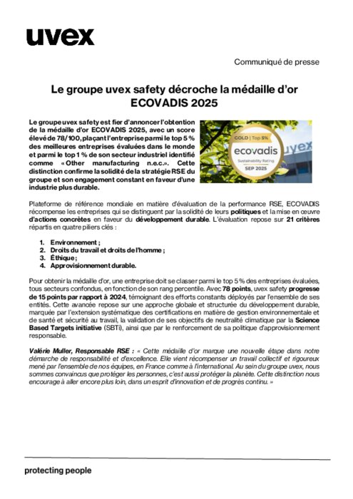 Le groupe uvex safety est fier d’annoncer l’obtention de la médaille d’or ECOVADIS 2025, avec un score élevé de 78/100, plaçant l’entreprise parmi le top 5 % des meilleures entreprises évaluées dans le monde et parmi le top 1 % de son secteur industriel identifié comme « Other manufacturing n.e.c.». Cette distinction confirme la solidité de la stratégie RSE du groupe et son engagement constant en faveur d’une industrie plus durable.