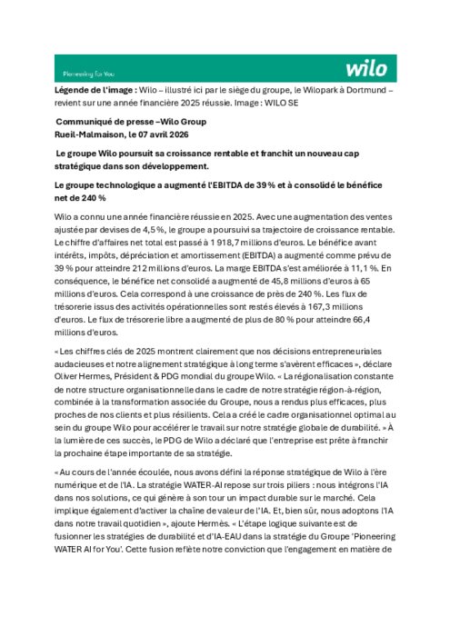 Wilo a connu une année financière réussie en 2025. Avec une augmentation des ventes ajustée par devises de 4,5 %, le groupe a poursuivi sa trajectoire de croissance rentable. Le chiffre d'affaires net total est passé à 1 918,7 millions d'euros. Le bénéfice avant intérêts, impôts, dépréciation et amortissement (EBITDA) a augmenté comme prévu de 39 % pour atteindre 212 millions d'euros. La marge EBITDA s'est améliorée à 11,1 %. En conséquence, le bénéfice net consolidé a augmenté de 45,8 millions d'euros à 65 millions d'euros. Cela correspond à une croissance de près de 240 %. Les flux de trésorerie issus des activités opérationnelles sont restés élevés à 167,3 millions d'euros. Le flux de trésorerie libre a augmenté de plus de 80 % pour atteindre 66,4 millions d'euros.