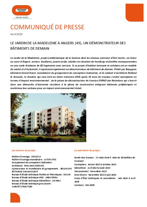 Si ce projet d’habitat innovant et solidaire est un modèle de mixité et d’inclusivité, il représente également un démonstrateur du bâtiment de demain. Piloté par Bouygues bâtiment Grand Ouest, mandataire du groupement de conception-réalisation, et le cabinet d’architecte Rolland & Associés, le chantier qui sera livré au 2ème trimestre 2025 après 23 mois de travaux s’avère exemplaire en termes d’impact environnemental.