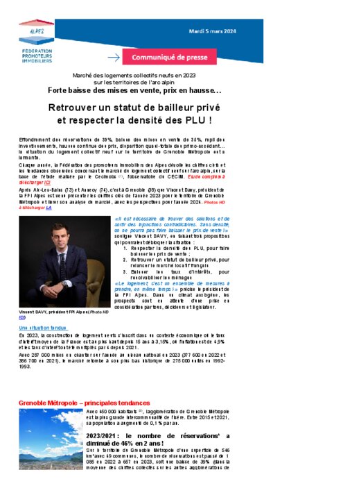 Chaque année, la Fédération des promoteurs immobiliers des Alpes dévoile les chiffres clefs et les tendances observées concernant le marché du logement collectif neuf sur l’arc alpin, sur la base de l’étude réalisée par le Cecimobs, l’observatoire du CECIM.