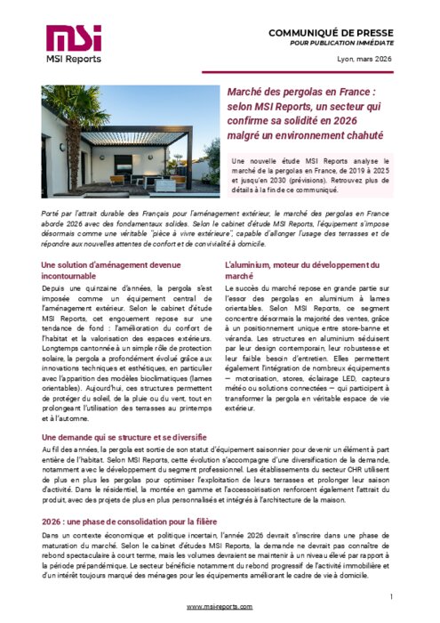 Porté par l’attrait durable des Français pour l’aménagement extérieur, le marché des pergolas en France aborde 2026 avec des fondamentaux solides. Selon le cabinet d’étude MSI Reports, l’équipement s’impose désormais comme une véritable “pièce à vivre extérieure”, capable d’allonger l’usage des terrasses et de répondre aux nouvelles attentes de confort et de convivialité à domicile.