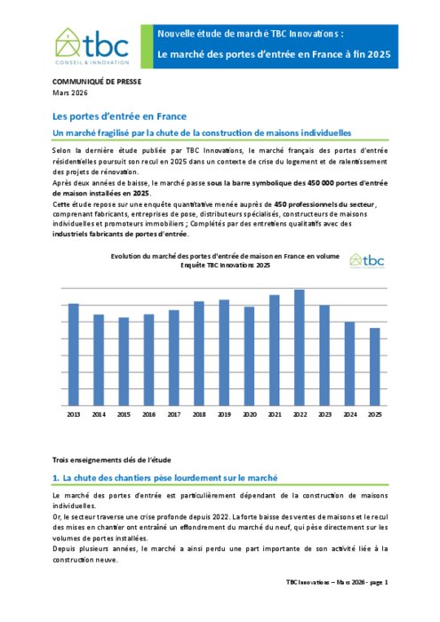 Selon la dernière étude publiée par TBC Innovations, le marché français des portes d’entrée résidentielles poursuit son recul en 2025 dans un contexte de crise du logement et de ralentissement des projets de rénovation. Après deux années de baisse, le marché passe sous la barre symbolique des 450 000 portes d’entrée de maison installées en 2025. Cette étude repose sur une enquête quantitative menée auprès de 450 professionnels du secteur, comprenant fabricants, entreprises de pose, distributeurs spécialisés, constructeurs de maisons individuelles et promoteurs immobiliers.
