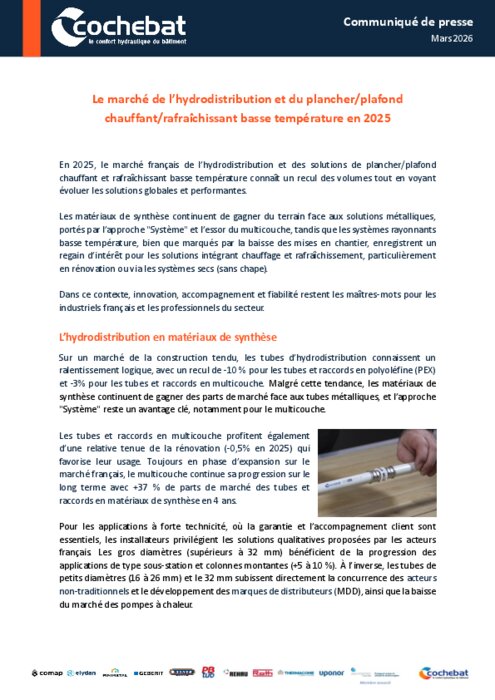 Institutionnels 27 mars 2026 - 14:49 En 2025, le marché français de l’hydrodistribution et des solutions de plancher/plafond chauffant et rafraîchissant basse température connaît un recul des volumes tout en voyant évoluer les solutions globales et performantes. PDF (461 Ko) Télécharger credit Cochebat