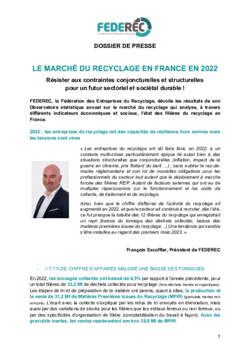 FEDEREC, la Fédération des Entreprises du Recyclage, dévoile les résultats de son Observatoire statistique annuel sur le marché du recyclage qui analyse, à travers différents indicateurs économiques et sociaux, l’état des filières du recyclage en France.