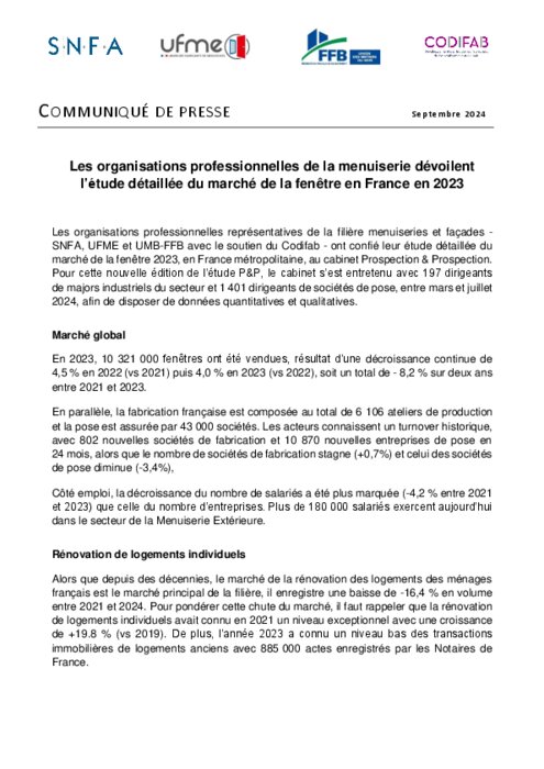 En 2023, 10 321 000 fenêtres ont été vendues, résultat d’une décroissance continue de 4,5 % en 2022 (vs 2021) puis 4,0 % en 2023 (vs 2022), soit un total de - 8,2 % sur deux ans entre 2021 et 2023. En parallèle, la fabrication française est composée au total de 6 106 ateliers de production et la pose est assurée par 43 000 sociétés. Les acteurs connaissent un turnover historique, avec 802 nouvelles sociétés de fabrication et 10 870 nouvelles entreprises de pose en 24 mois, alors que le nombre de sociétés de fabrication stagne (+0,7%) et celui des sociétés de pose diminue (-3,4%).