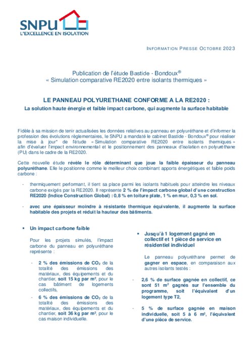 Fidèle à sa mission de tenir actualisées les données relatives au panneau en polyuréthane et d’informer la profession des évolutions règlementaires, le SNPU a mandaté le cabinet Bastide - Bondoux pour réaliser la mise à jour de l’étude « Simulation comparative RE2020 entre isolants thermiques » afin d’évaluer l’impact environnemental et le positionnement des panneaux d’isolation en polyuréthane (PU) dans le cadre de la RE2020.