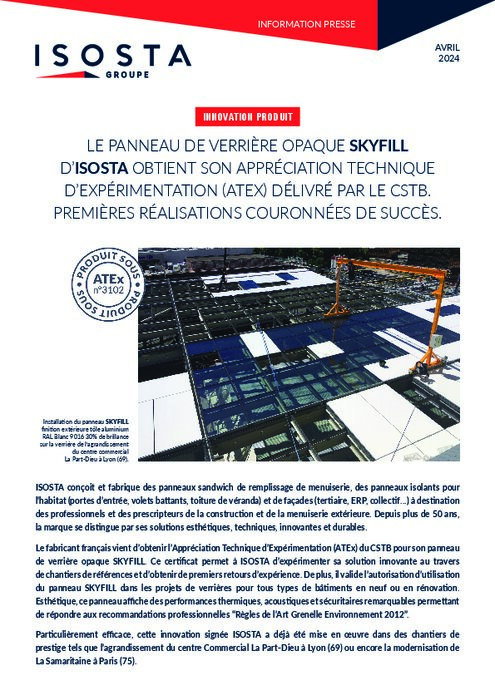 Isosta vient d’obtenir l’Appréciation Technique d’Expérimentation (ATEx) du CSTB pour son panneau de verrière opaque SKYFILL. Ce certificat permet à ISOSTA d’expérimenter sa solution innovante au travers de chantiers de références et d’obtenir de premiers retours d’expérience. De plus, il valide l’autorisation d’utilisation du panneau SKYFILL dans les projets de verrières pour tous types de bâtiments en neuf ou en rénovation.