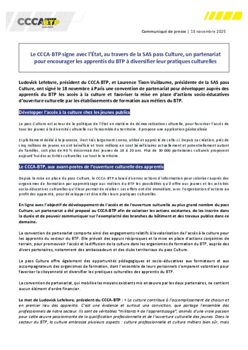 Ludovick Lefebvre, président du CCCA-BTP, et Laurence Tison-Vuillaume, présidente de la SAS Pass Culture, ont signé le 18 novembre à Paris une convention de partenariat pour développer auprès des apprentis du BTP les accès à la culture et favoriser la mise en place d’actions socio-éducatives d’ouverture culturelle par les établissements de formation aux métiers du BTP.