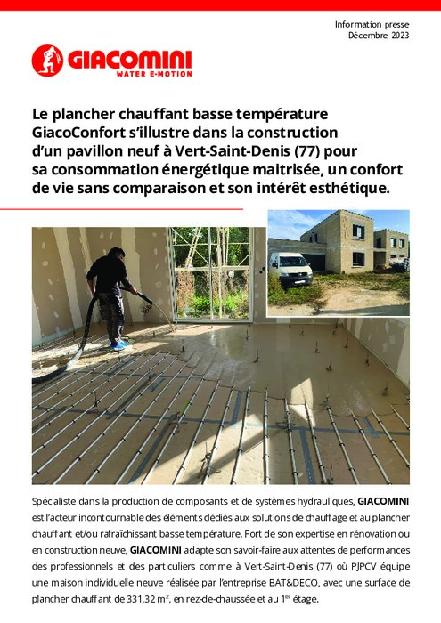 Fort de son expertise en rénovation ou en construction neuve, Giacomini adapte son savoir-faire aux attentes de performances des professionnels et des particuliers comme à Vert-Saint-Denis (77) où PJPCV équipe une maison individuelle neuve réalisée par l’entreprise BAT&DECO, avec une surface de plancher chauffant de 331,32 m², en rez-de-chaussée et au 1er étage.