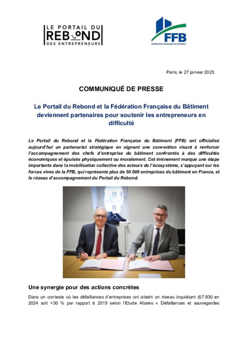 Le Portail du Rebond et la Fédération Française du Bâtiment (FFB) ont officialisé aujourd’hui un partenariat stratégique en signant une convention visant à renforcer l’accompagnement des chefs d’entreprise du bâtiment confrontés à des difficultés économiques et épuisés physiquement ou moralement. Cet événement marque une étape importante dans la mobilisation collective des acteurs de l’écosystème, s’appuyant sur les forces vives de la FFB, qui représente plus de 50 000 entreprises du bâtiment en France, et le réseau d’accompagnement du Portail du Rebond.