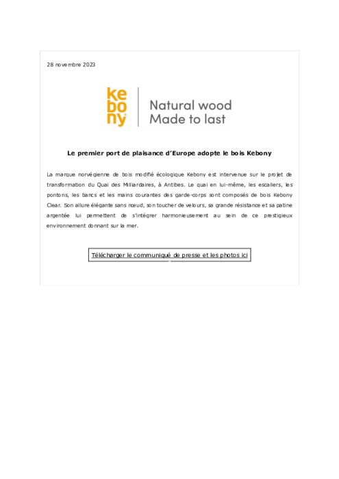 La marque norvégienne de bois modifié écologique Kebony est intervenue sur le projet de transformation du Quai des Milliardaires, à Antibes. Le quai en lui-même, les escaliers, les pontons, les bancs et les mains courantes des garde-corps sont composés de bois Kebony Clear.