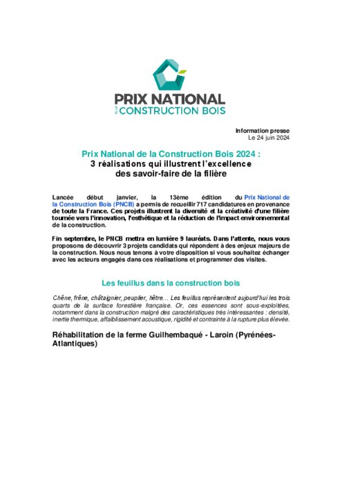 Lancée début janvier, la 13e édition du Prix National de la Construction Bois (PNCB) a permis de recueillir 717 candidatures en provenance de toute la France. Ces projets illustrent la diversité et la créativité d’une filière tournée vers l’innovation, l’esthétique et la réduction de l’impact environnemental de la construction. Fin septembre, le PNCB mettra en lumière 9 lauréats. Dans l’attente, nous vous proposons de découvrir 3 projets candidats qui répondent à des enjeux majeurs de la construction. Nous nous tenons à votre disposition si vous souhaitez échanger avec les acteurs engagés dans ces réalisations et programmer des visites.