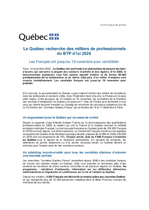 Le Québec est confronté à un phénomène de pénurie de main-d’œuvre, qui concerne la plupart des secteurs d’activité et des régions. D’ici 2026, le Gouvernement québécois s’est fixé comme objectif d’attirer et de former 60.000 professionnels de la construction et du Génie. Déjà plus d’un millier d’emplois sont ouverts immédiatement. Les candidats français ont jusqu’au 19 novembre pour postuler.