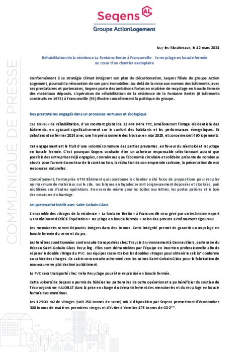 Conformément à sa stratégie Climat intégrant son plan de décarbonation, Seqens filiale du groupe Action Logement, poursuit la rénovation de son parc immobilier. Au-delà de la mise aux normes des bâtiments, avec ses prestataires et partenaires, Seqens porte des ambitions fortes en matière de recyclage en boucle fermée des matériaux déposés. L’opération de réhabilitation de la résidence de la Fontaine Bertin (8 bâtiments construits en 1972) à Franconville (95) illustre concrètement la politique du groupe.