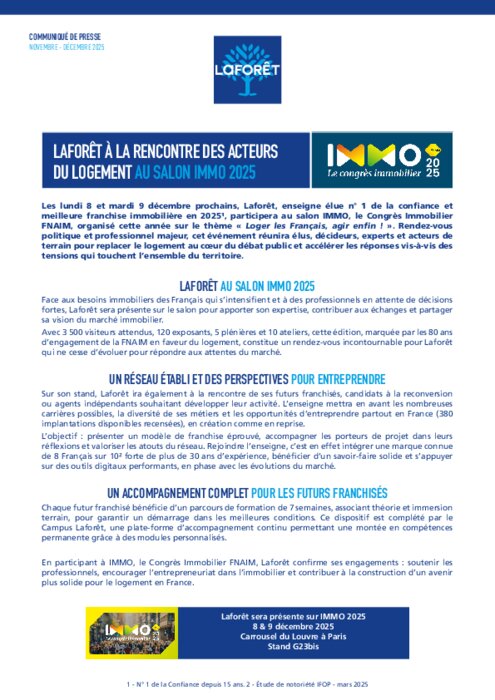 Le réseau immobilier Laforêt sera présent les 8 et 9 décembre prochains au salon Immo, le Congrès immobilier de la Fnaim, organisé autour du thème « Loger les Français, agir enfin ! ». L’occasion de (re)découvrir le modèle de la franchise tel que proposé par Laforêt.