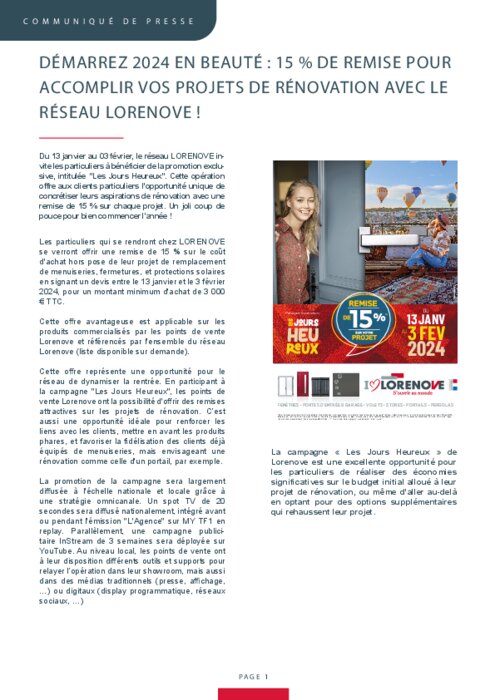 Du 13 janvier au 03 février, le réseau LORENOVE invite les particuliers à bénéficier de la promotion exclusive, intitulée "Les Jours Heureux". Cette opération offre aux clients particuliers l'opportunité unique de concrétiser leurs aspirations de rénovation avec une remise de 15 % sur chaque projet. Un joli coup de pouce pour bien commencer l’année.