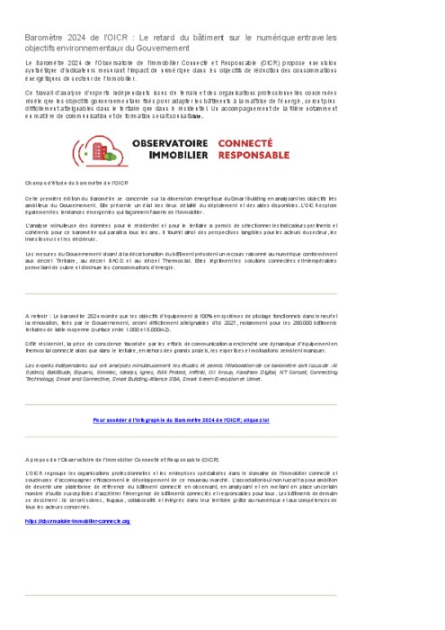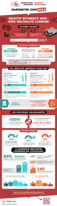 Institutionnels 23 janvier 2024 - 14:41 Le Baromètre 2024 de l’Observatoire de l'Immobilier Connecté et Responsable (OICR) propose une vision synthétique d’indicateurs mesurant l’impact du numérique dans les objectifs de réduction des consommations énergétiques du secteur de l’immobilier. PDF (100 Ko) Télécharger PDF (841 Ko) Télécharger