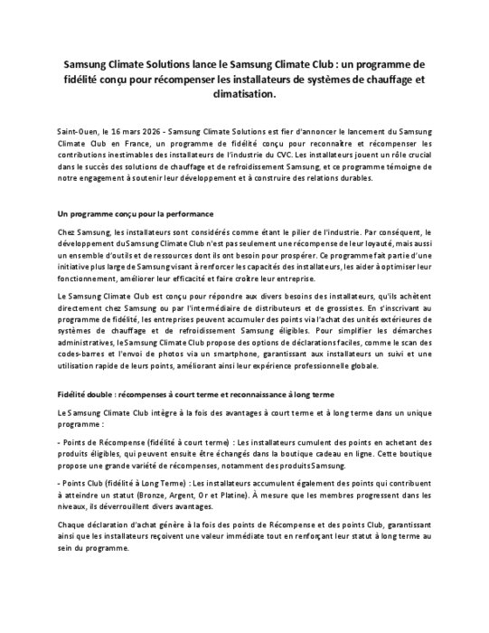 Samsung Climate Solutions est fier d'annoncer le lancement du Samsung Climate Club en France, un programme de fidélité conçu pour reconnaître et récompenser les contributions inestimables des installateurs de l’industrie du CVC. Les installateurs jouent un rôle crucial dans le succès des solutions de chauffage et de refroidissement Samsung, et ce programme témoigne de notre engagement à soutenir leur développement et à construire des relations durables.