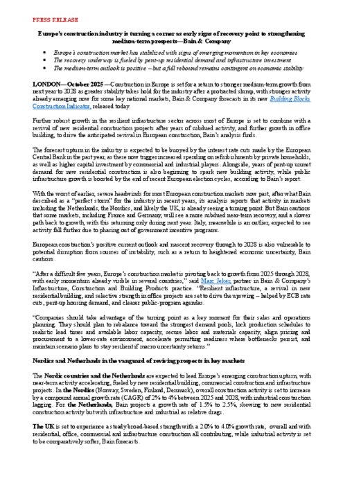 Selon Bain et Company, le secteur de la construction en Europe montre  des signes de reprise après plusieurs années difficiles. Entre 2025 et 2028, la croissance devrait s’accélérer, soutenue par une stabilisation économique, la baisse des taux d’intérêt de la BCE, et un regain d’investissement public et privé.