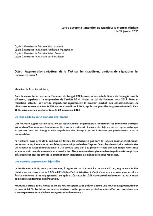 France Gaz Liquides, aux côtés de plusieurs acteurs majeurs de l'énergie, vient d'adresser une lettre ouverte au Premier ministre, demandant le retrait de l'article 10 du Projet de Loi de Finances 2025, qui propose de porter la TVA sur les chaudières à 20 %. Cette mesure fait suite à une récente augmentation de 5,5 % à 10 % le 24 décembre 2024 dernier, qui avait déjà accentué la pression sur les ménages et le secteur de l’énergie.