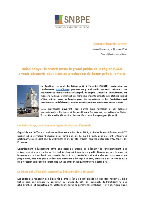 Le Syndicat national du Béton prêt à l’emploi (SNBPE), partenaire de l’événement Indus’3days, propose au grand public de venir découvrir les méthodes de fabrication du béton prêt à l’emploi. L’objectif : comprendre, de manière ludique, comment ce matériau incontournable est élaboré avant d’être utilisé, dans la foulée, pour les structures et les fondations qui soutiennent les bâtiments, routes et constructions modernes, entre autres.