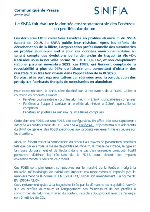 Les dernières FDES collectives Fenêtres en profilés aluminium du SNFA datant de 2019, le SNFA publie leur révision. Après les efforts de décarbonation de la filière, l’organisation professionnelle des menuiseries en profilés aluminium met à jour ces données environnementales en tenant compte des évolutions de la démarche de traçabilité Alu+C-.
