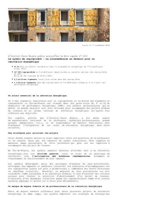 Une enquête, pilotée par L’Institut Paris Region, a été menée auprès de représentants nationaux de la profession (syndicats professionnels, grands groupes immobiliers, etc.), et de responsables de cabinets franciliens, afin d'analyser l'intégration de cet enjeu de rénovation énergétique dans leurs activités.