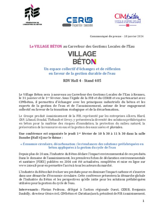 Le Village Béton sera à nouveau au Carrefour des Gestions Locales de l’Eau à Rennes, le 31 janvier et le 1 er février. Sous l’égide de la FIB et du CERIB et en partenariat avec CIMbéton, il permettra d’échanger avec les principaux industriels du béton et les experts de la gestion de l’eau et de l’assainissement, autour de leur engagement collectif en faveur de la transition écologique et de la décarbonation.