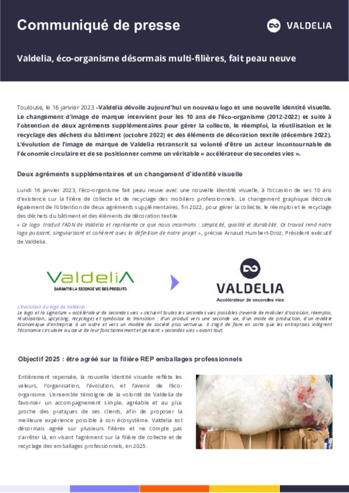 Valdelia dévoile aujourd’hui un nouveau logo et une nouvelle identité visuelle. Le changement d'image de marque intervient pour les 10 ans de l’éco-organisme (2012-2022) et suite à l’obtention de deux agréments supplémentaires pour gérer la collecte, le réemploi, la réutilisation et le recyclage des déchets du bâtiment (octobre 2022) et des éléments de décoration textile (décembre 2022).