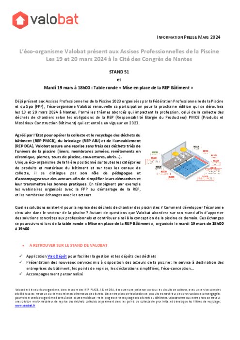 et du Spa (FPP), l’éco-organisme Valobat renouvelle sa participation pour la prochaine édition qui se déroulera les 19 et 20 mars 2024 à Nantes. Parmi les thèmes abordés qui impactent la profession, celui de la collecte des déchets de chantiers selon les obligations de la REP (Responsabilité Elargie du Producteur) PMCB (Produits et Matériaux Construction Bâtiment) qui est entrée en vigueur en 2023.
