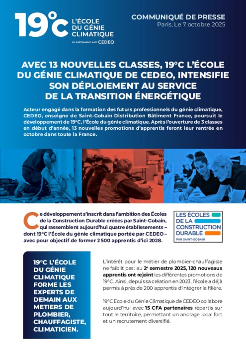 Acteur engagé dans la formation des futurs professionneles du génie climatique, Cedeo (enseigne de Saint-Gobain Distribution Bâtiment France) poursuit le développement de 19°C, l'École du génie climatique. Après l'ouverture de 3 classes en début d'année, 13 nouvelles promotions d'appentis feront leur rentrée en octobre dans toute la France.