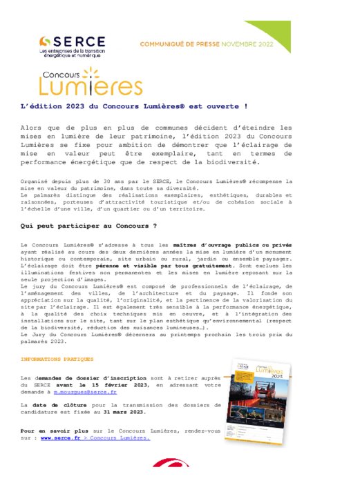 Organisé depuis plus de 30 ans par le SERCE, le Concours Lumières récompense la mise en valeur du patrimoine, dans toute sa diversité. Le palmarès distingue des réalisations exemplaires, esthétiques, durables et raisonnées, porteuses d’attractivité touristique et/ou de cohésion sociale à l’échelle d’une ville, d’un quartier ou d’un territoire.