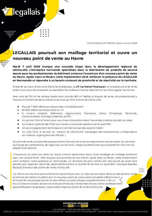 Mardi 7 avril 2026 marque une nouvelle étape dans le développement régional de LEGALLAIS. L’entreprise normande spécialisée dans la distribution de produits de second œuvre pour les professionnels du bâtiment annonce l’ouverture d’un nouveau point de vente au Havre. Après Caen et Rouen, cette implantation vient renforcer la présence de LEGALLAIS en Normandie et répondre à un besoin croissant de proximité et de réactivité sur le territoire.