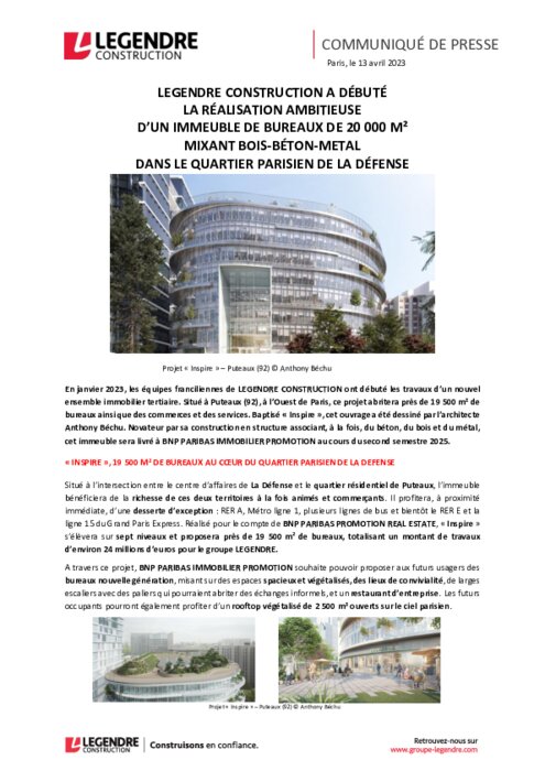 En janvier 2023, les équipes franciliennes de LEGENDRE CONSTRUCTION ont débuté les travaux d’un nouvel ensemble immobilier tertiaire. Situé à Puteaux (92), à l’Ouest de Paris, ce projet abritera près de 19 500 m² de bureaux ainsi que des commerces et des services. Baptisé « Inspire », cet ouvrage a été dessiné par l’architecte Anthony Béchu. Novateur par sa construction en structure associant, à la fois, du béton, du bois et du métal.