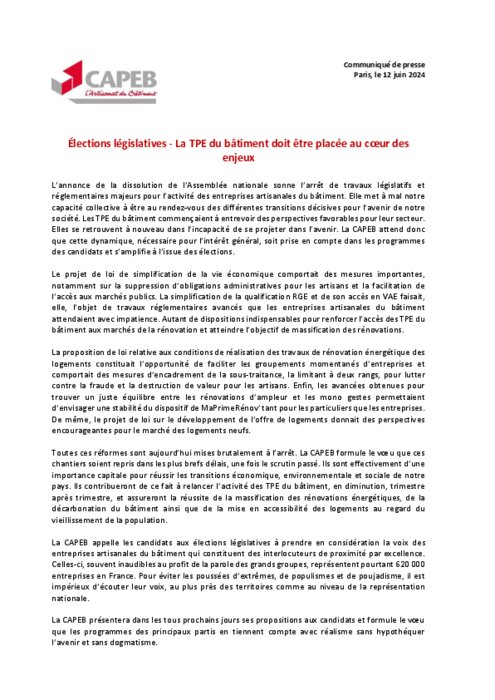 Les TPE du bâtiment commençaient à entrevoir des perspectives favorables pour leur secteur. Elles se retrouvent à nouveau dans l’incapacité de se projeter dans l’avenir. La CAPEB attend donc que cette dynamique, nécessaire pour l’intérêt général, soit prise en compte dans les programmes des candidats et s’amplifie à l’issue des élections.