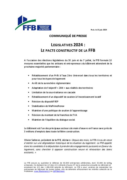 Institutionnels 13 juin 2024 - 10:43 À l’occasion des élections législatives du 30 juin et du 7 juillet, la FFB formule 10 mesures essentielles que les artisans et entrepreneurs du bâtiment attendent de la prochaine majorité parlementaire. PDF (187 Ko) Télécharger Crédits : Assemblée Nationale