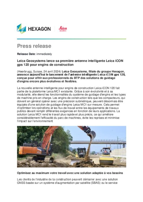 Industriels 24 avril 2024 - 12:03 Leica Geosystems, filiale du groupe Hexagon, annonce aujourd'hui le lancement de l’antenne intelligente Leica iCON gps 120, conçue pour offrir aux professionnels du BTP des solutions de guidage d'engins encore plus évolutives et flexibles. PDF (164 Ko) Télécharger