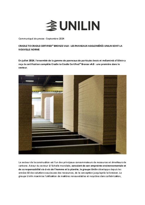 Industriels 03 septembre 2024 - 11:16 En juillet 2024, l'ensemble de la gamme de panneaux de particules bruts et mélaminés d’Ulinin a reçu la certification complète Cradle to Cradle Certified Bronze v4.0 : une première dans le secteur. PDF (605 Ko) Télécharger