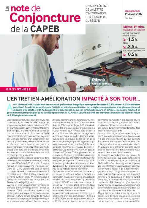 Au 1er trimestre 2024, la croissance des travaux de performance énergétique est en perte de vitesse (+0,5 %, contre +1,5 % au trimestre précédent). Ce ralentissement impacte l’activité en entretien-amélioration, qui enregistre son premier recul en glissement annuel depuis la crise sanitaire (-0,5 %). En parallèle, la construction neuve est, ce trimestre encore, en difficulté, bien que le recul soit en glissement annuel moins rapide qu’au trimestre précédent (-3,5 %). Ainsi, le volume d’activité des entreprises artisanales du bâtiment recule de -1,5 % en glissement annuel.