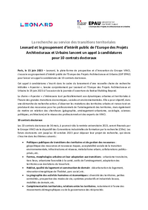Leonard, la plate-forme de prospective et d’innovation du Groupe VINCI, s’associe au groupement d’intérêt public de l’Europe des Projets Architecturaux et Urbains (GIP EPAU) pour lancer un appel à candidatures de 10 contrats doctoraux.